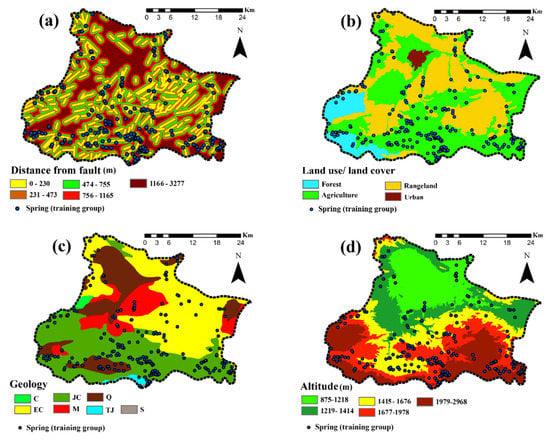 As mentioned by Crozier [], preparation of corresponding thematic data layers and the selection of factors are important components of any model. In this study, 10 karst spring-affecting factors including distance from fault, land use/land cover, geology, topographic elevation, slope angle, slope aspect, plan curvature, topographic wetness index (TWI), drainage density and distance from river were utilized for producing KSPMs.