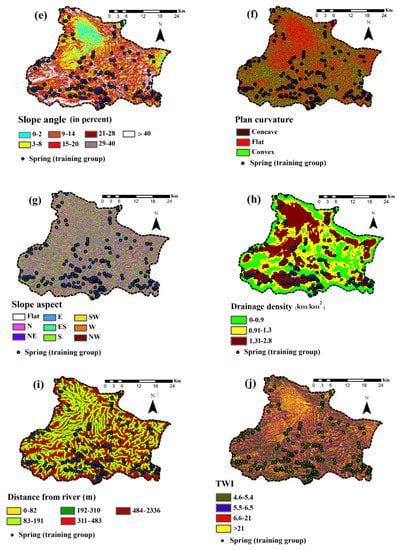 Karst spring inventory: (a) distance from fault, (b) land use/land cover, (c) geology, (d) topographic elevation, (e) slope angle, (f) plan curvature, (g) slope aspect, (h) drainage density, (i) distance from river and (j) TWI.