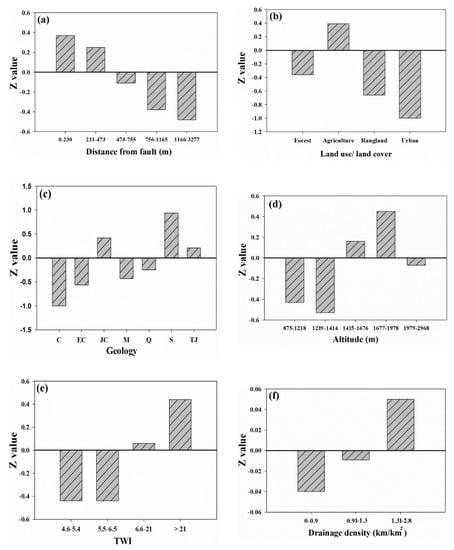 In the case of land use/land cover, urban areas and agriculture have the least and most impact on groundwater, respectively. The impervious surface areas in urban areas tend to reduce recharge and hence groundwater availability. As the agriculture areas as a consequence factor need to high water requirement, these areas have a higher potential to groundwater recharge []. It was also found that there was no significant correlation between spring occurrence and topographic elevation classes. Areas with elevation ranges of 1676–1978 m and 1414–1676 m have positive influence on spring occurrence probability with CF values of 0.45 and 0.16 which indicate a good karst spring occurrence probability. In another study in this region, Rahmati et al. [] indicated that spring occurrence probability will reduce as elevation decreases which is in agreement with the results of our study. It is noted that, groundwater is more probable to occur in areas with high TWI values because it is well apparent in Figure 4e that positive correlation exists between increasing spring occurrence and high TWI value.