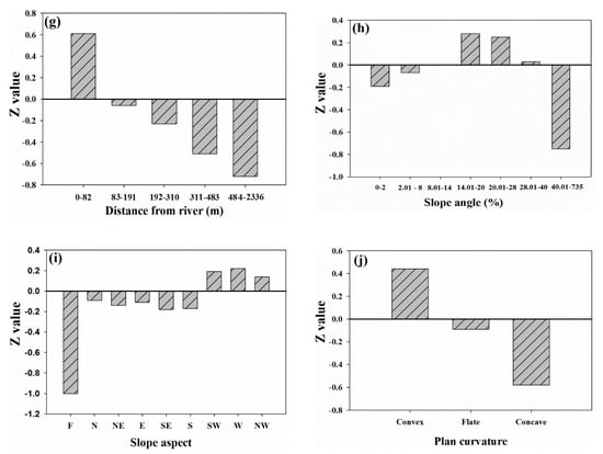 Conversely, Razandi et al. [] stated that there is not positive correlation between groundwater occurrence and TWI, which shows a higher groundwater potential over a decreasing TWI value. The reason of this difference between their results and our achievements refer to geomorphological characteristics of study areas (i.e., their study area were plain whereas our study area is a mountainous region). In areas where drainage density ranges from 1.3 to 2.8 km/km2 (CF = 1.82), groundwater potential is higher indicating that springs are more probable in areas with denser drainage density. The assessment of distance from river demonstrated that areas with lower distance from river have more potential for spring occurrence and as this distance increase, the probability to groundwater occurrence decreases. Lee et al. [] proved these results by indicating that drainage density and distance from the river have positive and negative influence on groundwater yield. Results indicated that the areas with 8–40° slope angles have positive influences with highest value in 14–20° and 20–28° with CF values of 0.28 and 0.25. Manap et al. [] also mentioned that flat to moderate slopes have higher groundwater probabilities.