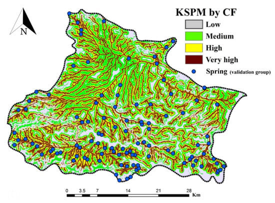 In the case of slope aspect, only west (0.22), southwest (0.19) and northwest (0.14) have a positive influence on groundwater occurrence. It is difficult to explain this result, but it might be related to the differences of aspects in terms of vegetation, soil depth and recharge potential. Plan curvature behavior also illustrates that springs are more probable to occur in convex areas. Moghadam et al. [] also stated that concave areas are more favorable for groundwater compared to the convex slope. Finally, according to the CF value for each influencing factor, karst spring probability map was produced and then categorized into four classes; namely low, medium, high and very high using the natural break classification method (Figure 5), as suggested by Naghibi et al. []. Areas with high and very high karst spring potential are seen to be near rivers and faults.