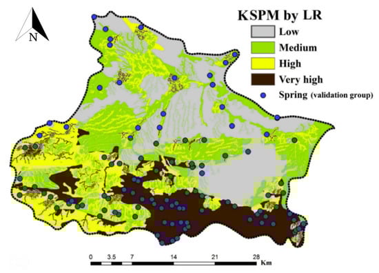 where CGeology is the LR coefficient for geology factor, whereas CLand use is the LR coefficient for land use factor. All coefficients of Equation (8) were obtained from Table 3. The final generated map using LR model was then classified into low, medium, high and very high classes using the natural break classification method (Figure 6), as suggested by Naghibi et al. []. Areas with high and very high potential to karst springs are located in southwest to southeast of the study area.