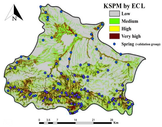 Although LR was capable to implement multivariate statistical analysis, it had some weakness in analyzing the classes of each occurrences conditioning factor. Conversely, the CF model could evaluate the influence of classes of each spring-affecting factor on an occurrence. However, the relationship between karst spring locations and spring-affecting factors was mostly neglected by LR model. As a result, it can be clearly seen that CF and LR models had some weakness when applied individually. The generated map of ensemble CF and LR (ECL) model was prepared and then classified into low, moderate, high and very high classes using the natural break classification method (Figure 7), as suggested by Naghibi et al. [].