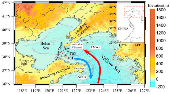 The Bohai Strait (BHS) between Shandong and Liaodong peninsula is the only pathway connecting two epeiric seas in the northern China, the Bohai Sea (BH) and the North Yellow Sea (NYS) (Figure 1). The ~104 km wide BHS is the shallowest in the southern end, growing deeper northward with a channel as deep as 70 m offshore Liaodong Peninsula [4] (Figure 1). BH is a semi-enclosed shallow (<18 m) marginal sea that is located to the west of BHS [5]. The surface sediment distribution of the BH is characterized by fine-grained sediment covering the southwestern area and coarser sediment covering the east [6]. In BHS, the coarse silt covers the south and it gradually becomes coarser in the north with coarse sand and gravel. The sedimentation rate of the BH is lower than 0.3 cm/yr, except for the central mud area which is ~2 cm/yr [7]. The tidal regime in the BH is dominated by mixed semidiurnal tide with two main tidal constituents of K1 and M2. The maximum tidal current occurs in the north of the BHS with the velocity of 1 m/s [8]. The tidal range in the BHS is lower than 2 m [9]. The residual currents in the BHS are mainly impacted by seasonal monsoon activates and thermal/saline stratifications [10]. The winter circulation in the BH and Yellow Sea (YS) are mainly driven by the intense winter monsoon, while the circulations in summer are maintained by the tilting thermohaline as the wind is much weaker and heat flux is much stronger. Due to the prevailed strong northerly winds, the regional dynamics in winter are significantly stronger than those in other seasons [11]. As a densely populated and important economic zone, the state of the marine environment of BH has been of great concern. Several rivers discharge large amounts of nutrients, pollutants and other terrestrial materials into the BH. In particular, the Yellow River, the second largest river in terms of riverine sediment, transported about 1.2 Gt of terrestrial sediments into the BH annually [12,13,14,15]. Such terrestrial sediments not only accumulated quickly near the estuary, but also transported to the open ocean, through the BHS, contributing to the marine environmental and the geological evolution of the East China Sea [11,16,17,18]. Therefore, accurately characterizing the flux of water and sediment through BHS is of great importance.