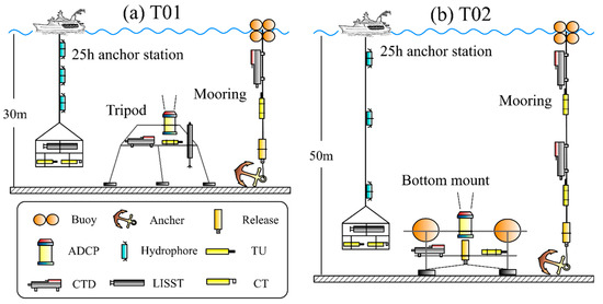 The field data came from both moored time-series (Tripod, Bottom Mount and Moorings) and shipboard hydrographic surveys (25 h anchor stations) from January 2 to January 13, 2018. Bottom mounted platforms and subsurface moorings for time-series measurements were placed at two stations in the BHS, with T01 in the south at 30 m water depth and T02 in the north at 50 m water depth (Figure 2). The various type of instruments, their settings and placements are listed in Table 1.