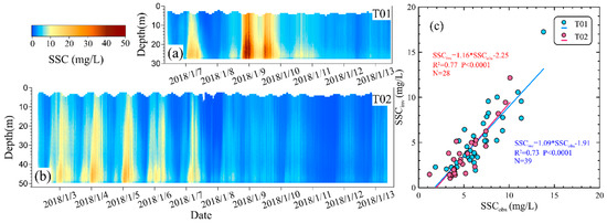 is calculated by the backscatter intensity (E) measured by ADCP according to . is the conversion number of raw backscatter from a dB scale to a voltage scale. is the near-field correction related to (distance from the measuring point to the transducer), the radius of the transducer and the signal wavelength; is a constant and is a measure of the instrument sensitivity; is the parameter of the scattering properties of sediment with mixed mineralogy, which depends on the particle size, particle distribution characteristics and backscattering of suspended particles; is the absorption of sound by seawater, which depends on temperature, salinity, depth and pH (during observation: temperature is 7℃, salinity is 32 PSU and pH is 8). In this study, the calculated was 0.019 nepers/m. In order to validate the accuracy of SSC obtained by inversion, we fitted the inversed SSC (SSCinv) with the measured SSC (SSCobs), their relationship shown in Figure 4c. SSCinv and SSCobs have a good relationship (determination coefficient (R2) is 0.75), which means that SSCinv can replace the real SSC during observation. The inversed SSC profiles are shown in Figure 4a,b.