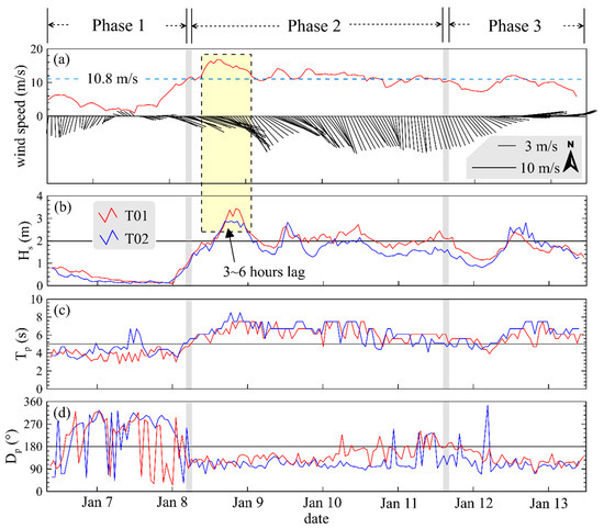 Wave had an obvious response to the wind with a lag of 3–6 hours (Figure 5b–d). The peak of wind occurred between 1 pm and 3 pm on January 8, 2018, while the peak of significant wave height () occurred between 6 pm and 7 pm on January 8, 2018. During P1, the in the BHS was overall lower than 1 m and gradually decreasing, the peak period () was about 4 seconds and the peak direction () was relatively chaotic. As the intense wind was coming, the significantly increased with the maximum of greater than 3 m on January 8 and the in T01 was overall higher than that in T02 during the P2. The also increased to 7-8 seconds. The was stable and rotated clockwise along with the winds. As the northerly wind subsided, gradually decreased, as did the . Until the wind turned to westerly or southwesterly, the rose to 2 m again. At this moment, the of T02 was higher than that of T01. The remained stable and consistent with the wind direction.