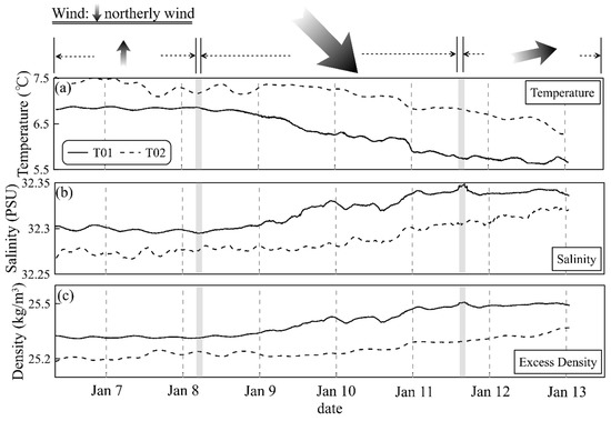 Time-series of hydrological characteristics (temperature (a), salinity (b) and excess density (c)) in T01 and T02 during observation).