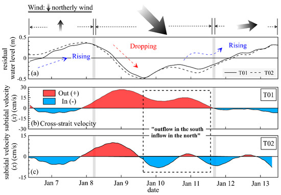The variation of the water level was consistent with that of the wind (Figure 7a). During P1, the water level was continuously rising about 0.3 m within two days under the effect of the weak wind. In the beginning of P2, the overall water level of BHS plunged about 0.8 m in one day affected by the intense wind and then gradually recovered with a periodic fluctuation during the later phase of P2 and throughout P3. As the circulations around BHS were barotropic processes in winter [32], only depth-averaged currents were used. Figure 7b,c shows the variation of the cross-strait subtidal current at T01 and T02 respectively. The variation of subtidal currents also corresponded well with the wind. During P1, both southern strait and northern strait showed a weak inflow, with a relatively low velocity of ~0.1 m/s. In the initial phase of P2, as the wind increased significantly, both the north and south of the strait showed intense outflow, with a velocity of about ~0.27 m/s on the south and ~0.1 m/s on the north. As the wind continued, the southern side continued to be dominated by the strong outflow, while the northern side shifted to a fluctuating inflow with a period of 2–3 days. At this moment, the circulation in BHS showed a traditional pattern: "inflow in the north and outflow in the south". During P3, as the wind gradually subsided and shifted, both the north and south of the strait were dominated by inflow again, with the flow velocity of the north stronger than that of the south. The results showed the P1 and P3 had some similarities that the water level of the strait was continuously rising accompanied by a consistent inflow during the wind relaxation or reversal. The outflows mainly appeared during the intense wind and dominated the southern strait. Consequently, on the synoptic scale, the circulation structure of BHS was incredibly sensitive to the oscillation of the wind condition, rather than simply "inflow in the north and outflow in the south". The underlying mechanism of variation of circulation modulated by synoptic events would be discussed in the following sections.
