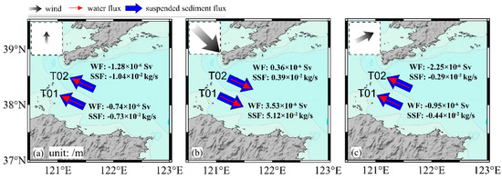 The unit-width water flux (red arrows) and suspended sediment flux (blue arrows) at observed depths at site T01 and T02 under different wind conditions. (a) Weak northerly or southerly wind (P1); (b) intense northerly wind event (P2); (c) wind relaxation or reversal (P3).