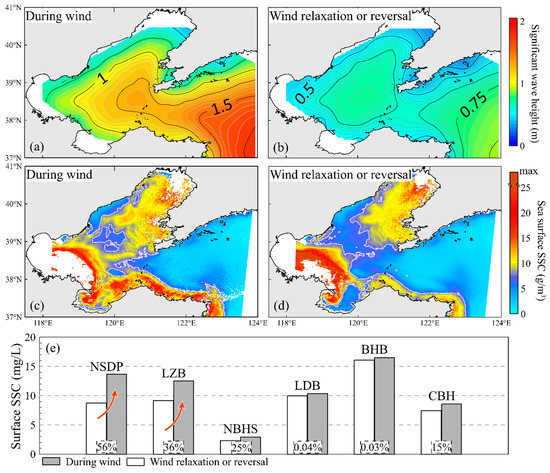 Spatial distribution of significant wave height during different wind conditions on winter 2018: (a) during intense wind; (b) wind relaxation or reversal. Spatial distribution of sea surface SSC during different wind conditions on winter 2018: (c) during intense wind; (d) wind relaxation or reversal. The significant wave height are available at WAVEWATCHⅢ Global model: http://ww3.cimh.edu.bb/. The data of sea surface SSC are available at GOCI: http://kosc.kiost.ac.kr/eng/p10/kosc_p11.html. (e) The variation of sea surface SSC in different regions during different wind conditions. Northern Shandong Peninsula (NSDP), Laizhou Bay (LZB), Northern Bohai Strait (NBHS), Liaodong Bay (LDB), Bohai Bay (BHB) and Center of Bohai Sea (CBS). The percentage in the dashed frames indicate the variation rate.