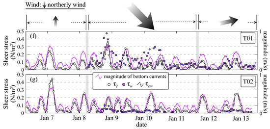 To further illustrate the control factors of different responses of SSC on the southern and northern sides of BHS during different wind conditions, we employed the empirical formulas for bottom shear stress calculation proposed by Soulsby (1995) [48] and Van Rijn (1993) [49] to calculate wave-induced shear stress , current-induced shear stress and combined wave and current shear stress :