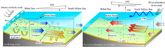Figure 13. Schematic diagrams to show the different transport patterns through the Bohai strait under the impacts of the intense northerly wind (a) and wind relaxations or reversals (b) respectively. - After the wind weakened or shifted, the preceding accumulation of SSH was unleashed, forming a northward compensatory flow. The wind-triggered CTW carried a high-water level propagated northward along the western coast of the Korean peninsula and facilitated the YSWC [41]. During this time, the relatively high SSH in the northern BHS is geostrophically balanced by an inflow from YS to BH. Meanwhile, SSC decreased due to the weak wave and a small part of sediment is brought back to BH (Figure 13b).