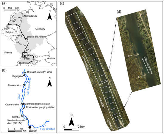 The Rhine River is the third largest river in Europe with a length and drainage basin equal to 1250 km and 185,000 km, respectively. The Upper Rhine, a 300 km long section located between Basel and Bingen-am-Rhein, shows a nivo-glacial hydrological regime (Figure 1a). The mean annual discharge has been estimated at 1059 m/s at the Basel gauging station (during the period 1891–2008) [38]. Since the beginning of the 19th century, the Upper Rhine has been profoundly impacted by several engineering works. These works induced the severe degradation of both geomorphological conditions (e.g., simplification of channel patterns, narrowing and stabilization of the main channel, bed incision, and armoring) and ecological function (losses of habitat diversity and dynamics). These effects were notably observed along a 50 km by-passed reach parallel to the Grand Canal d’Alsace (GCA) downstream of Basel [39] (Figure 1b). Since 2010, several restoration actions, including an increase in instream flow [40], gravel augmentations [41,42], and controlled bank erosion with the implementation of two transverse groynes [43], have been performed along this by-passed reach to enhance the bedload transport and morphodynamics therein and thus diversify aquatic and riverine habitats. In December 2010, the instream flow entering the Old Rhine increased from a quasi-constant discharge of 20–30 m/s to a seasonally varying discharge of 52–150 m/s in accordance with the life cycle of native fish species [44]. An initial experiment of controlled bank erosion was implemented in 2013 over a span of 300 m on the upstream part of the Old Rhine (KP 191.30–191.60; April–May 2013). This ecological action consisted of removing the bank protection and three old groynes built during the beginning of the 20th century (Figure 1d) and implementing two new transverse groynes within the flow channel to maximize flow velocities and shear stresses along the bank. The location and shape of these groynes had been previously defined through numerical and physical modeling to promote bank erosion, deliver sediment into the channel, and avoid any damage to human construction due to uncontrolled lateral erosion [45].