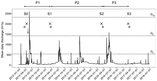 The monitoring was composed of four states (S), namely, an initial state (S) and three periods (P). Since this restoration, the flood peaks reached 2600 m/s, 1400 m/s and 1590 m/s during P, P and P, respectively (Figure 2). The flood discharges were measured at the Rheinweiler gauging station (located 5 km upstream of the restored site). No tributaries are located between this gauging station and the studied reach. Following these flood events, only few bank erosion events occurred. However, significant and unexpected geomorphological changes, of the bathymetry and bed grain size, were observed that show that transverse groynes had significant effects on aquatic habitats. The latter motivated the implementation of our research strategy.