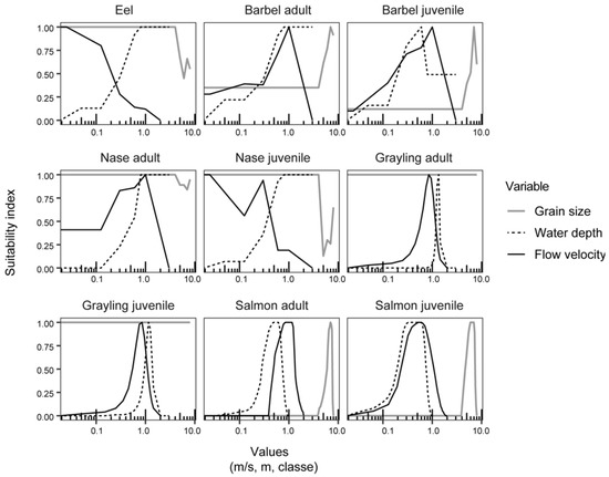In this study, the suitability curves were based on statistical relationships defined for six large rivers in France according to field observations (Table 1). Suitability curves were established for three categories of physical parameters: water depth, flow velocity, and bed grain size (Figure 4). We estimated the habitat quality for five native fish observed in the study reach (mostly for the adult and juvenile life stages): barbel (Barbus barbus), nase (Chondrostoma nasus), grayling (Thymallus thymallus), salmon (Salmo salar), and eel (Anguilla anguilla).