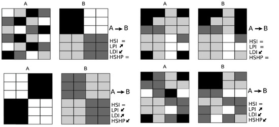 Example of the landscape evolution for a given HSI value and the dynamics of the landscape metrics. HSI, LPI, LDI, and HSHP correspond to the habitat suitability index, the largest patch index of a highly suitable habitat, the landscape division index, and the highly suitable habitat proportion, respectively. LPI, LDI, and HSHP were calculated for patches that were judged to be highly suitable (HSI ≥ 0.5) and are represented in black.