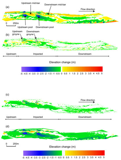 During P, contrasting channel adjustments occurred following the intense flood of May–June 2013 (Q < 15 years). The bed was scoured by 0.1 m to 0.5 m in the upstream section, whereas both bed scouring (max. of 1 m) and bed deposition (max. of 0.7 m) occurred on the two riffles located in the downstream section (Figure 5a). In the impacted section, new macroforms appeared with the formation of two mid-bars downstream of the two artificial groynes, where the deposition thickness ranged from 0.1 m to 2.5 m (Figure 5a–c), and scouring (max. of 4 m) occurred in two pools at the eastern extremity of the artificial groynes. During P, the upstream and downstream sections morphologically evolved less than during P, with less than 0.5 m of scouring and deposition occurring. Moreover, in the impacted section, the bed was globally eroded. During P, generalized scour of the bed occurred along the whole study reach, reaching a maximum of 2 m locally in the upstream pool. Nevertheless, macroforms were clearly still present during the whole monitoring period (Figure 5d). These channel responses induced a significant increase in the CSD values within the impacted section during the whole monitoring period, whereas the CSD values in the upstream and downstream sections remained globally stable (Figure 6e).