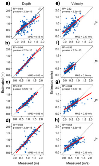 The hydraulic models reliably simulated the two hydraulic variables, namely, the water depth and flow velocity. The mean absolute error (MAE) values for the simulated water depths are equal to 0.18 m, 0.05 m, 0.08 m, and 0.11 m for S, S, S, and S, respectively (Figure 6a–d). Likewise, the MAE values for the simulated flow velocities are equal to 0.17 m/s, 0.14 m/s, 0.19 m/s, and 0.15 m/s for S, S, S, and S, respectively (Figure 6e–h). The lower accuracy of the simulations related to the first survey during S, especially for the water depths, is probably due to the lower quality of the DEM [29], which was produced using a single-beam echosounder rather than airborne LiDAR topo-bathymetric surveying, which is characterized by a high density of points per square metre.