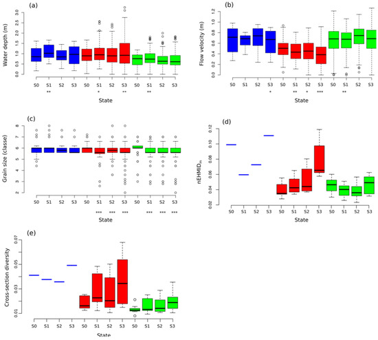 Boxplots of the physical parameters calculated on all cross-sections for each state and for each section at 52 m/s: (a) water depth (m), (b) flow velocity (m/s), and (c) bed grain size. The results of the paired Wilcoxon test performed between each state and the initial state (S) for each physical variable are indicated as follows: * = p < 0.05, ** = p < 0.01, *** = p < 0.001. The number of sampling points in the upstream, impacted and downstream sections is 11, 74 and 122, respectively. Boxplots (d) of the nEHMID and (e) of the CSD index calculated for each cross-section, state and section. The number of cross-sections for the upstream, impacted, and downstream sections is 1, 6, and 11, respectively. Blue, red, and green boxplots correspond to the upstream, impacted, and downstream sections, respectively. S, S, S, and S correspond to each monitoring state.