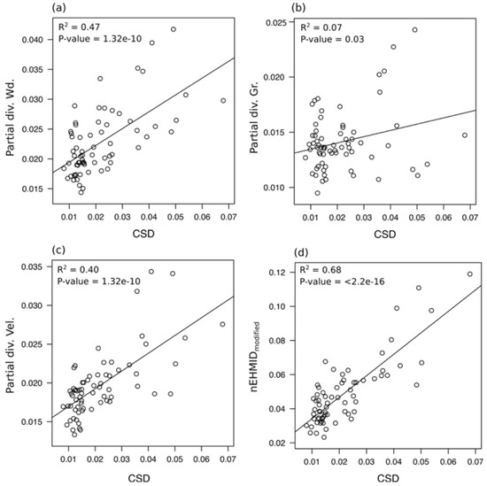 Plots of (a) partial diversity of the water depth, (b) partial diversity of the bed grain size, (c) partial diversity of the flow velocity and (d) nEHMIDm according to CSD. R corresponds to the coefficient of determination (square of the Pearson correlation).