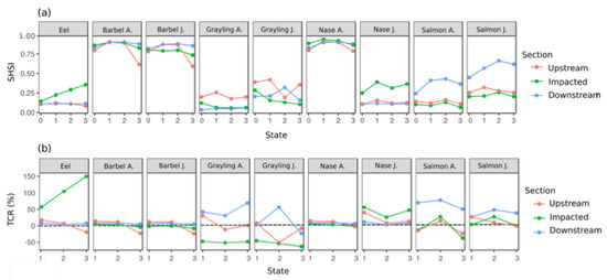 Significant changes in the TCR values were calculated for both the impacted and the downstream sections (Figure 9b). In the impacted section, the TCR values were positive for both eel and juvenile nase species with a maximum at S equal to +149% and juvenile nase with a maximum at S equal to +57%. At S, positive TCR values in the downstream section were related to juvenile and adult salmon species with maxima equal to +78% and +48%, respectively, and adult grayling with a maximum of +57% at S (Figure 9b). Globally, during the monitoring period, the TCR values calculated within the upstream section were stable, except for juvenile grayling during S with a TCR value equal to −52% (Figure 9b).