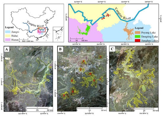 Floodplains are among the most productive ecosystems in the world and the inundation area, in particular, is an important component which is critical to biodiversity conservation [,]. Most fundamental ecological functions and services in the floodplain ecosystem, such as flood mitigation, food production, recreation and biodiversity sustenance, and the support of human wellbeing and cultural values, are related to the inundation area []. In the wet season in the floodplain basin, monsoonal rains lead to gradually rising water levels which deliver sediment and nutrients to the inundation areas [], while, in the dry season, the water level drops, exposing inundation wetlands provide sustenance for many creatures, and triggering important life cycle processes []. Hydrological factors are the core driving force to maintain ecological process and function in wetland ecosystems []. Dynamics of flood duration, the timing of exposed and submerged that caused by water level fluctuations, are key factors that shaped differences in wetland landscapes []. Therefore, identifying the spatiotemporal pattern of inundation areas is important for figuring out wetland changes and their processes. The Yangtze River is a typical large floodplain [], however inundation areas in this region have decreased dramatically due to the building of dams and reclamation of land for agriculture []. Loss of inundation areas might lead to changes in wetland landscape structure and a decline of biological habitat and biodiversity [,].