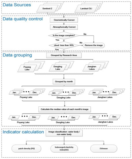 Inundation areas are the dominant component in the middle and lower Yangtze River floodplain, which support the functioning of the whole ecosystem, as well as biodiversity, through material and energy exchange driven by wet-dry alternation []. These areas are also critical for long-distance migratory water birds along the East Asia and Australian Flyway []. Most of these migratory birds depend on inundation areas as their wintering habitat []. Over the past several decades, in 1950s–1970s in particular, most lakes in this region have been cut off from the natural rhythms of the Yangtze River through the construction and operation of a series of dams or sluice gates, leaving only Dongting Lake and Poyang Lake which have naturally hydrological connectivity in the river basin. Whether there are differences between naturally connected lakes and the hydrologically isolated lakes physically? In particular, do the connected lakes have better flexibility than the isolated ones? To answer this question, it is necessary to extract the inundation areas as quickly as possible and make a quantitative analysis. Here, we establish the method to identify inundation areas of lakes from the multi-source remote sensing database on GEE, quantitatively analyze the structure and the dynamics of connected and isolated lakes by using the patch density (PD) and the submerged elasticity index (SEI, submerged elasticity index) in a common year (2017) and a drought year (2018).