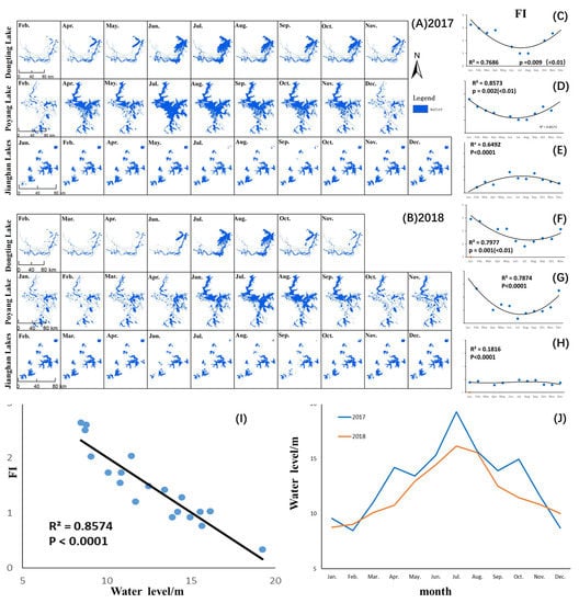 The areas and distribution of water surfaces were extracted from the multi-source remote sensing data for 2017 (Figure 3A) and 2018 (Figure 3B). It can be seen from the figures that PY and DT, which connected to the Yangtze River, have the similar hydrological regime. The largest water body areas occur in wet season (basically in July and August) and smallest water body areas occur in the dry season (from December until February). A different situation is apparent for the lakes in JH, which are isolated from the Yangtze River. In this case, the largest water surface area occurs in October, November, and December in 2017, and in November and December in 2018. There is little variation of waterbody over the course of the year for the lakes in JH.