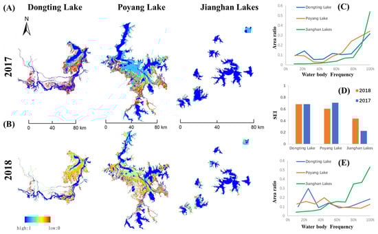 Water body frequency maps for DT, PY, and JH in 2017 (A) and 2018 (B). (C) Area ratio of water body frequencies for PY, DT, and JH in 2017 (C) and 2018 (E). (D) Submerged elasticity index (SEI) for DT, PY, and JH in 2017 and 2018.