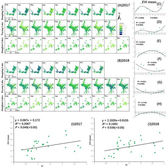 The distribution and variety of mean EVI in the three regions in 2017 (mean EVIA) and 2018 (Figure 3B) was also tested. The mean EVI of JH Lakes is lowest in winter and reaches its peak in summer in 2017 (Figure 5E) and 2018 (Figure 5H). In contrast, PY (Figure 5C) and DT (Figure 5D) reach the maximum mean EVI in winter with the smallest values occurring in summer. It is worth noting that in 2018, the mean EVI of PY (Figure 5F) and DT (Figure 5G) had two peaks, which occurred in March and April. P values of all fitting results are less than 0.0001, which can be seen from Figure 5.