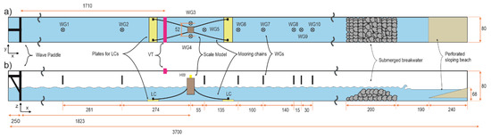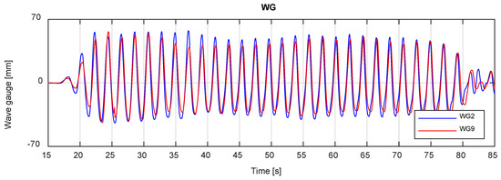 As indicated in Figure 1, along the centreline of the wave flume, and starting from the wave paddle, two WGs are located before (WG1 and WG2), and six WGs are located after, the model (WG5–WG10). At the location of the model, two WGs are installed along both sides of the model (WG3 and WG4). The last three WGs (WG8, WG9, WG10) are located close to the passive absorption dissipative beach and are used for wave reflection analysis according to the Mansar and Funke Method [22] (see Table 2 for distances between the WGs).