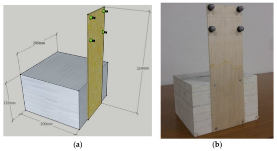 The BOX model has dimensions of 200 × 200 × 132 mm and is made of light PVC material with a density of 570 kg/m3 (Figure 2). A 324 mm high plate is attached to the front face of the BOX, on which reflective markers have been installed to be used by the OptiTrack 6-DOF motion tracking system (four grey spheres in Figure 2b).