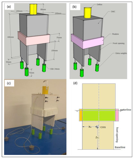 The OWC WEC model has a rectangular prism shape with 200 × 200 × 440 mm dimensions. The model was initially destabilized because the frontal and the back walls are asymmetrical to the principal symmetrical axis. Therefore, extra ballast is required to lower down the center of gravity (COG) to prevent capsizing. A 3D sketch of the OWC WEC model geometry (Figure 3a,b), the actual model built (Figure 3c), and the side cross-section of the model (Figure 3d) are shown in Figure 3. The main structure is built by using a light PVC material with a density of 570 kg/m3. In addition, there are light expanded polystyrene (EPS) foam blocks around the four sides; both the buoyancy and stability were enhanced to ensure safe operation during the tests. Orifices were drilled on the top plate of the scale model to simulate the OWC WEC turbine power-take-off (PTO) damping. The OWC WEC model was tested using three different orifice diameters (Table 1). The total mass of 778 g from the extra floaters (15 × 75 mm, thickness × height, indicated using pink color in Figure 3a) and bottom hanging weights (indicated using green color in Figure 3a) were attached to the model to ensure its balance. The extra weight of 55 g was attached on top of the model on the back wall, to satisfy the balance. The total weight of the four-ball markers (equal to those used in Figure 3c) used by the video motion tracking system was 6 g (1.5 g × 4). The weight of the air tube attached on the cover orifice (yellow color in Figure 3) and the support structure for the hot wire anemometer is 98 g for OWC WEC1, 58 g for OWC WEC2, 38 g for OWC WEC3; since OWC WEC4 had no top cover, no weight for the air tube and support structure was added. The total mass of each OWC is shown in Table 1. The center of gravity coordinates (XG and ZG) in Figure 3d are presented in Table 1. The model is symmetrical along the wave flume y-axis, and therefore YG has 0 mm offset from the Y-direction center plane.