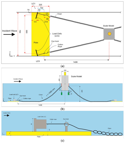 (a) Top view, (b) front view of the mooring system used for the BOX and the OWC WEC models, (c) detail of the load cell (LC) connection to the wave flume bottom (all dimensions are in mm).