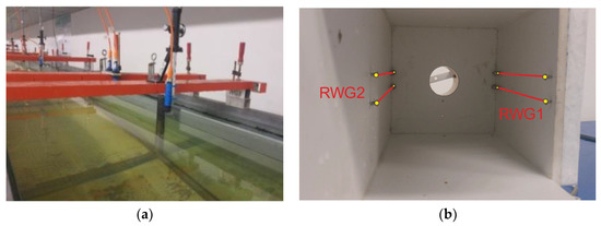 Two resistive wave gauges (RWGs) are installed inside the chamber of the OWC WEC model to measure the water surface variation in the chamber, which is directly related to the velocity of the water surface inside the chamber and the airflow rate at the PTO. RWG1 is installed on the internal side of the OWC WEC front wall (with regards to the wave propagation direction), and RWG2 is installed on the internal side of the OWC WEC rear wall (Figure 5b). The sampling frequency of the RWGs is 1 kHz.