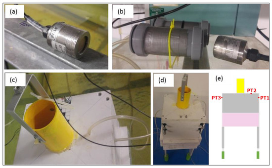 (a) Pressure transducers (PTs), (b,c) set-up of the pressure transducers on the floating OWC model (b,c,d), and (e) sketch of the PTs position on the OWC and pressure transducers’ (PTs) naming.