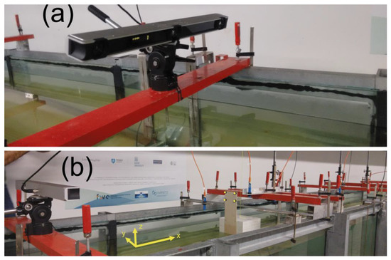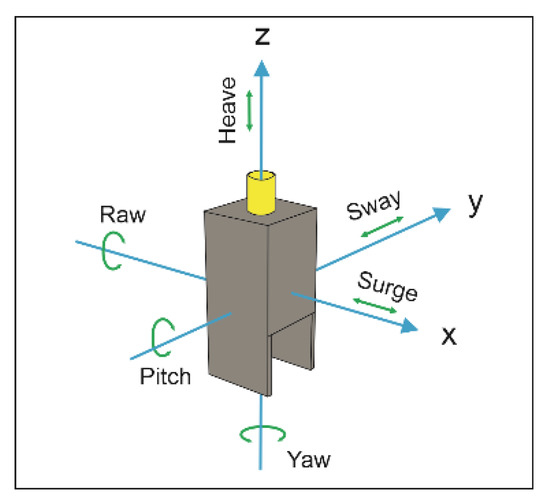 Moreover, a video motion tracking (abbreviated as VT) system OptiTrack, which uses a camera to process the location of a moving object (or multiple objects), with up to six degrees of freedom (6-DOF) of motion (see Figure 8) over time, is installed. During the present tests, the VT used three cameras, which were aligned on a metal bar (see Figure 9). The VT system was located perpendicular to the LABIMA-WCF axis, at a distance of 17.1 m from the wave paddle (see Figure 1). A sketch of the coordinate system used for the obtained 6-DOF data is shown in Figure 9b.