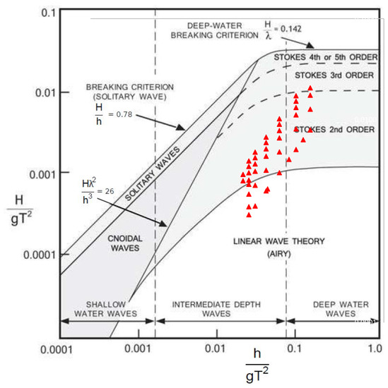 Figure 10 shows the diagram of the applicability of different theories of water waves [23]. Most of the waves are in the zone of nonlinear wave theory, and they fulfill the condition of the Stokes 2nd order wave theory in intermediate water depths.