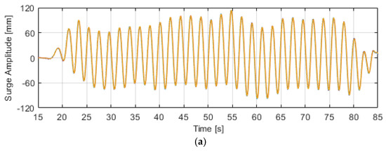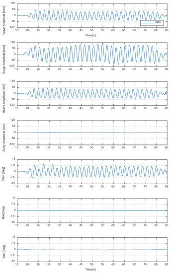The OWC WEC 6-DOF motions as a response to the incident waves are shown in Figure 12. As waves are regular, 2D, and long-crested, the observed significant OWC WEC model motions are surge, heave, and pitch. The sway motion amplitude is in a negligible range. The amplitude of the heave motion is very close to the incident wave amplitude, whereas the surge motion range is controlled and restrained by the mooring chain length. The surge and heave components led to a pitch motion of the OWC WEC ranging between −7.5 and +7.5 degrees.