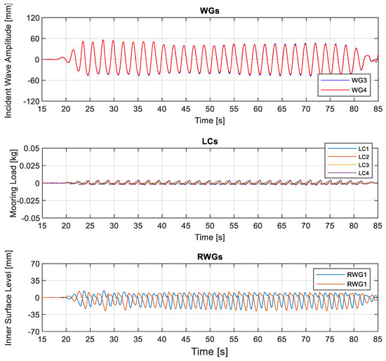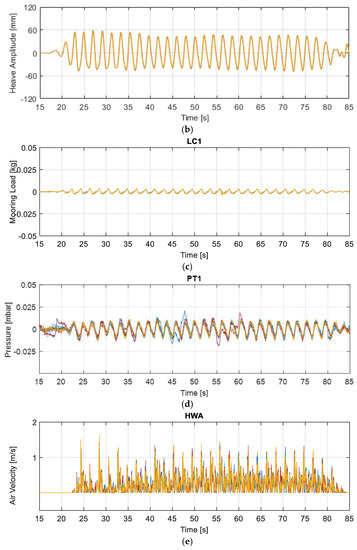 Figure 13 represents the simultaneous results of five different instrumentations for the case H14 (d = 0.625 m, H = 0.1 m, and T = 2.1 s). All results are synchronized. Free surface variation in the channel is measured by WG3 and WG4, which are installed at the model location. Water column surface oscillation amplitudes inside the OWC WEC chamber are rather low compared to the outside of the chamber, and they have a double peak. RWG signals are out of phase due to the differences in locations along the x-axis. The tested hydrodynamic condition (H14) is a moderate wave condition in which all chains stay on the ground and do not transmit the tension loads to LCs. The small variations on the LCs signals are related to the oscillation of the terminal part of the mooring chain (the one close to the LC), which was maintained partially detached from the bottom due to the specific connection whit LC via the cotton rope. (see LCs in Figure 13). Therefore, LCs in the same location, e.g., LC1 and LC3, have an in-phase and reflect the free surface variations. The variation of the water surface elevation and the air pressure inside the chamber represent the air exchange rate through the orifice so that the velocity of the water surface inside the chamber and the airflow rate at the PTO can be calculated, assuming air compressibility effect is negligible for small-model scales [14,25]. In fact, the air compressibility does not take place at the scale of the tested, as proved by [25], and the experimental measurements can be corrected in the later processing of data results, as proposed by [26]. Compare to the other sensor results, pressure sensor and hot-wire anemometer results show high scatter, which means they are more sensitive to any change in the water surface elevation inside the chamber.