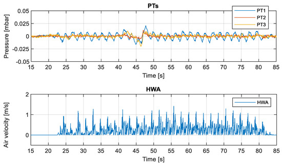 A hot-wire anemometer (abbreviated as HWA) was used to measure air velocity in the air tube (Figure 6b). The height of the tube is 88 mm (see the yellow tube in Figure 3a), and the sensor was placed in the middle of it.
