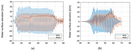Water surface variation for 30 nonlinear regular waves measured by WG2 and RWG1 (a) d = 0.625 m, H = 0.6 m, and T = 1.6 s, (b) d = 0.625 m, H = 0.6 m, and T = 1.0 s.