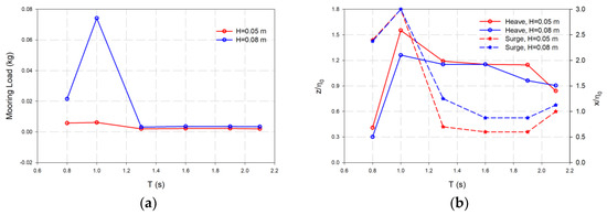 OWC WEC mooring line tension response for the heave and surge motions as a function of wave period (), (a) mooring loads, (b) normalized surge () and heave () motions (OWC3: d = 0.625 m, and H = 0.05, and H = 0.08 m).