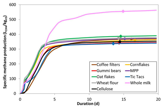 BMP tests were conducted using the Automatic Methane Potential Test System II (AMPTS II; Bioprocess Control, Sweden) following the guideline of Holliger et al. [3,32]. Due to limited capacity, and in order to avoid any bias by the inoculum used in each experiment, the substrates were tested in single assays in three independent trials. Blanks (inoculum-only bottles), as well as CEL, were carried out in triplicate in each trial. The ISR was 2 on a VS basis [3,4] resulting in a fresh matter mass of 30 g for whole milk and about 4 g for the other substrates. Operating volume was 450 mL and a mixing mode of 5 min mixing and 25 min rest was used. All tests were carried out under mesophilic conditions (38 ± 1 °C) at least until net daily methane production was less than 1% of the cumulative net gas production for three consecutive days [3], which is indicated by diamonds in the following graphs. Prior to incubation, all bottles were flushed with a mixture of N2 and CO2 (65% N2, 35% CO2) at a flow rate of 2.5 L per minute for 30 s to ensure a more than 5-times statistical exchange of the entire headspace of about 200 mL [33]. The AMPTS II system reports standardized (dry, 0 °C, 1 atm) cumulative methane volume from each bottle, which can be used to calculate both specific methane production (SMP) curve and final BMP. BMP was calculated following the standard approach [34] and double-checked by the Online Biogas App (OBA) [26].