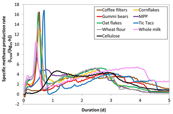 Gummi bears, oat flakes, and wheat flour, and to a lesser extent whole milk and mashed potato powder (MPP), showed a peak methane production after about half a day reaching specific methane production rates of more than 16 LCH4/(kgVS·d), while leveling off around 2 to 6 LCH4/(kgVS·d) for the next three to four days. Interestingly, Tic Tacs showed the highest peak, which occurred about four hours later than for gummi bears. Since Tic Tacs are composed only of sugar, this delay is surprising at first glance. Assuming that the ISR of 2 was properly chosen to avoid an accumulation of volatile fatty acids (VFA), the reason for the minimal delay in reaching the methane production peak compared to gummi bears or even more complex substrates, such as wheat flour and oat flakes, was probably that—according to the packaging—carnauba wax was applied as a glazing agent, which potentially delayed the dissolution of sugar.