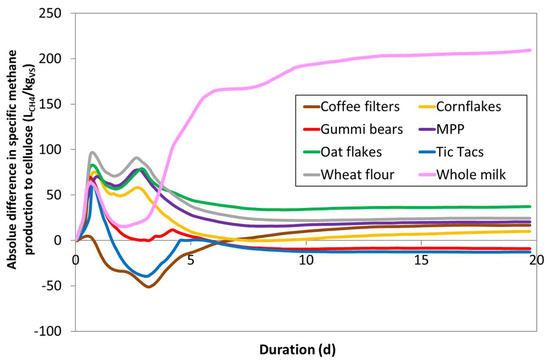 Wheat flour, oat flakes, MPP, and cornflakes depict a very similar behavior of two initial peaks during the lag-phase of CEL followed by convergence reaching finally a surplus between 10 and 37 LCH4/kgVS. The curves for gummi bears and Tic Tacs are characterized by only one initial peak followed by a similar (gummi bears) or even lower (Tic Tacs) methane production compared to CEL achieving a minimal negative value (−9 and −13 LCH4/kgVS, respectively). Among all substrates tested, gummi bears had the most CEL-like methane production. Still, owing to its high share of easily degradable sugar, the buffer capacity of the inoculum is challenged more than in the case of CEL.