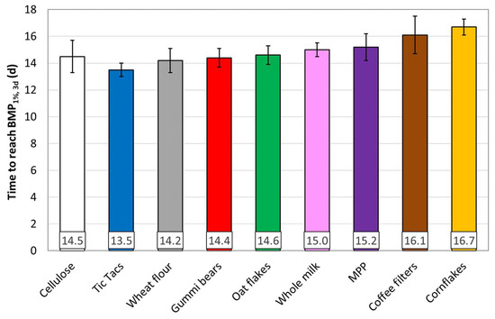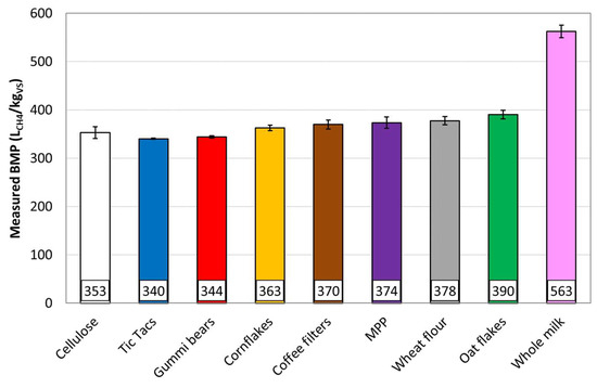 Tic Tacs had the lowest RSD in the measured BMP; they reached the termination criterion the fastest, and also the standard deviation among the replicates of this time was the lowest. A potential downside of Tic Tacs is the fact that it is composed of easily degradable sugar only, potentially leading to souring (acidification) of the process in case the inoculum is not well-buffered, neither requiring hydrolysis nor the presence of other microorganism groups besides sugar degraders. Gummi bears can at least compensate this disadvantage somehow, containing also starch, some proteins and little lipids as well, while achieving otherwise a similar good performance. It is worth mentioning that distinguishing between complex carbohydrates (including both starch and fiber, represented by the chemical formula of C6H10O5; max. theoretical BMP of 414 LCH4/kgVS) and simple sugars (represented by the chemical formula of C12H22O11; max. theoretical BMP of 392 LCH4/kgVS) is important to guarantee a good approximation of the theoretical maximum BMP. This differentiation is fortunately often provided on the packaging, as it is also important from a dietary point of view. While glucose is often used as model substrate for sugars [27,37], it is assumed that sucrose is the most dominant form of sugars in groceries [38]. Whole milk might be chosen when a balanced ratio between (simple) carbohydrates, proteins and lipids is needed in order to test the performance of all kinds of degraders, although hydrolysis is not required/checked either. Coffee filters are potentially a good alternative when CEL is not available.