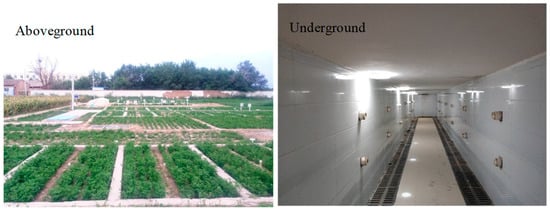 The experiment was carried out in non-weighing lysimeters (Figure 1), whose sides and bottom were made of concrete to prevent seepage, with an area of 6.66 m2 (3.33 m × 2 m), and a depth of 3 m. The soil filled in was sandy loam, with an average dry bulk density of 1.5 g cm−3 and the field capacity (θf) of 0.30 m3 m−3, the wilting point (θwp) of 0.13 m3 m−3, and saturation water content of 0.37 m3 m−3 in 0-100 cm. The basic physical properties of the soil were presented in Table S1 [37]. The experiment set up eight treatments with two irrigation amount levels in 2018, i.e., full irrigation and deficit irrigation (W1 and W2), and four soil salinity levels, i.e., 0, 2‰, 4‰ and 6‰ salt (mass ratio) per unit soil mass in the 0–60 cm soil (S0, S2, S4 and S6), and four treatments (W1S0, W2S2, W2S4 and W2S6) in 2019, representing full irrigation with no salt stress, deficit irrigation with 2‰ soil salt content, deficit irrigation with 4‰ soil salt content and deficit irrigation with 6‰ soil salt content. To minimize the boundary layer effect, alfalfa were planted around the lysimeters with a width of more than 1 m and with the same management.