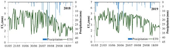 Meteorological data during the experiment were collected every 15 minutes by an automatic weather station (Hobo, Onset Computer Corp., Bourne, MA, USA) about 100 m away from the experimental plots. Daily precipitation and ET0 were shown in Figure 2. Daily ET0 was calculated by the FAO-56 Penman–Monteith formula [5].